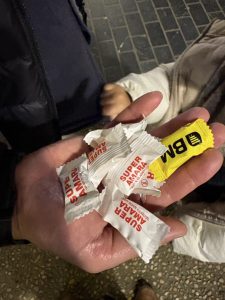 - キャンディの嵐: 子どもたちが大興奮する瞬間!王やキャラクターが投げるキャンディをキャッチするために、手を伸ばしたり、袋を持参する家族連れが多いです。キャンディをゲットするのは意外と至難の業。近くに落ちたキャンディを拾うので精一杯、隣の優しい方が子供にと分けてくれました。ありがたい😊